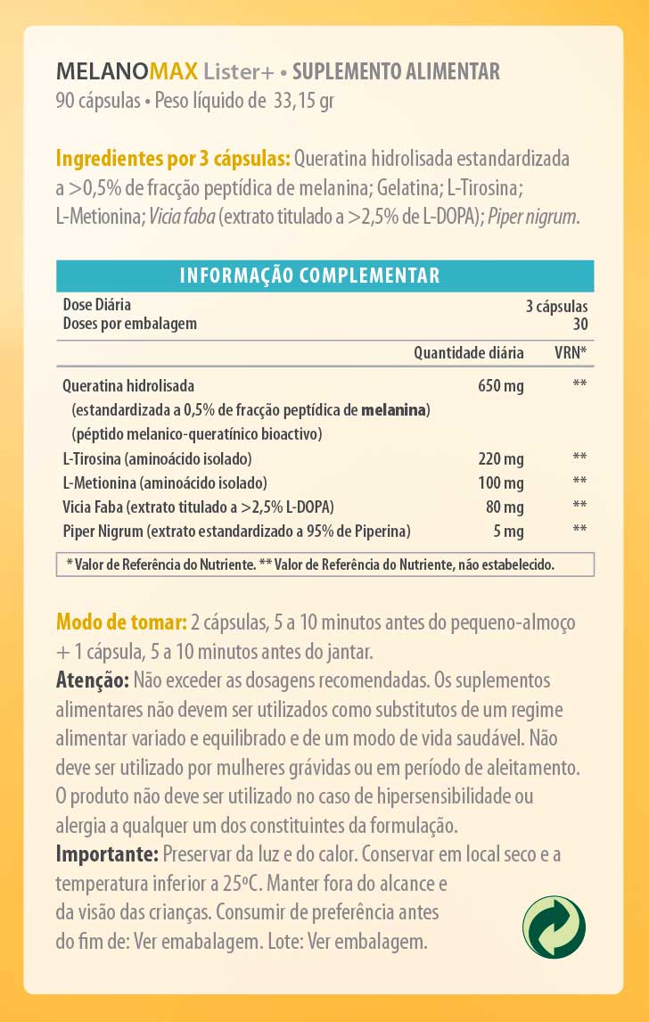 | Queratina hidrolizada (estandarizada a> 0,5% de fracción de péptido de melanina) (péptido melánico – queratina bioactiva) | 650 mg. |